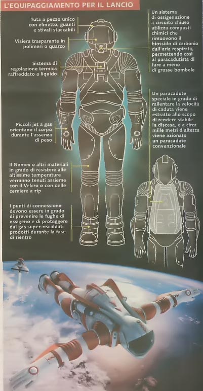 È in arrivo dall'America il più estremo tra tutti gli sport: il paracadutismo spaziale. Due veterani dell'industria aerospaziale stanno infatti lavorando alla realizzazione di una speciale tuta high-tech che dovrebbe consentire a chi la indossa di paracadutarsi sulla Terra direttamente dallo spazio esterno, evitando di bruciare durante il rientro nell'atmosfera e raggiungendo in tutta sicurezza la superficie del nostro pianeta. I responsabili del progetto - Rick Tumlinson e Jonathan Clark - mirano a soddisfare contemporaneamente le esigenze degli amanti degli sport estremi e ad offrire un efficace sistema di salvataggio a tutti gli astronauti del futuro.